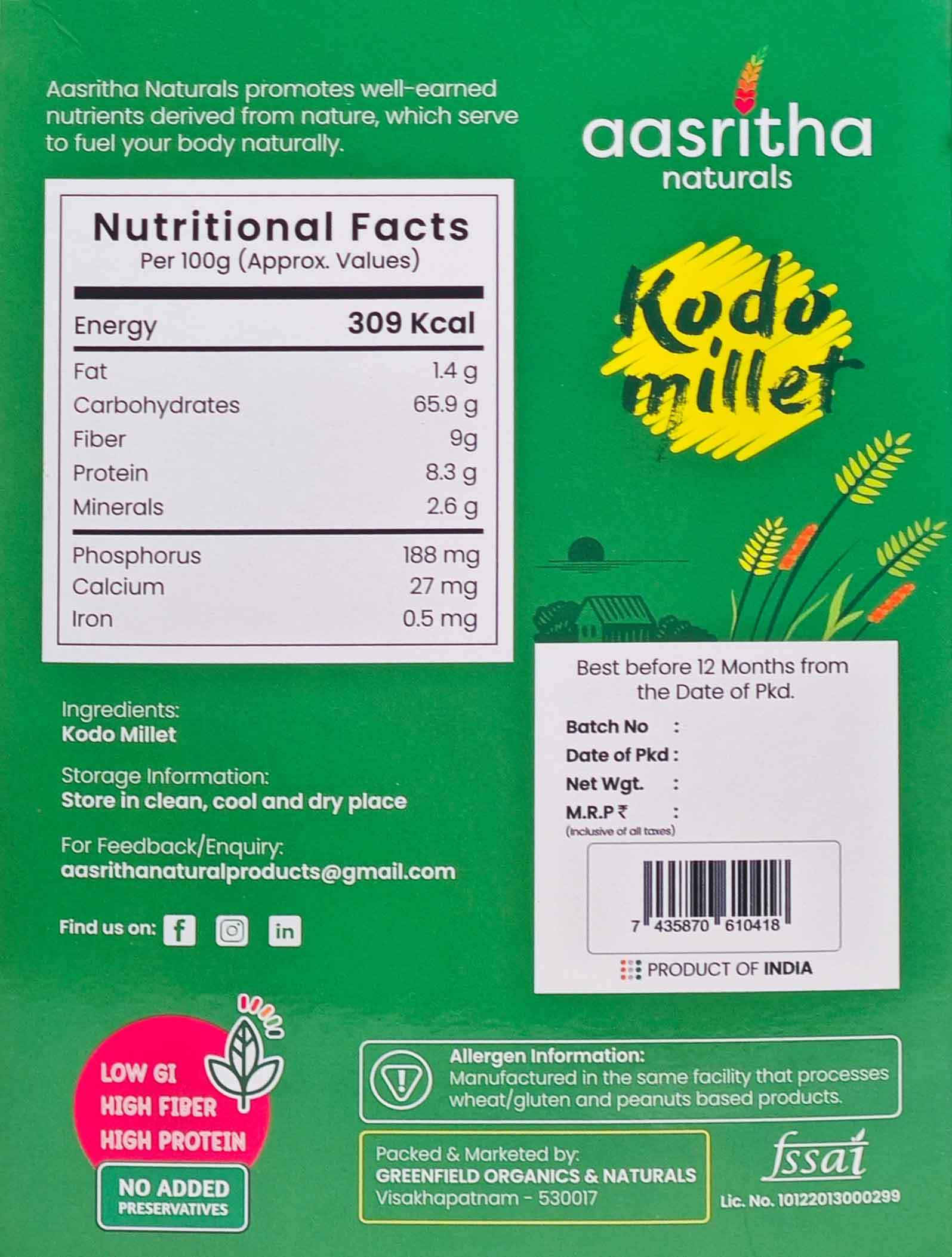 Kodo Millet, known as Arikelu in Telugu, is a traditional, gluten-free grain celebrated for its high fiber content and therapeutic benefits. This 500g pack is a perfect choice for those seeking a wholesome, nutrient-dense alternative to polished grains.