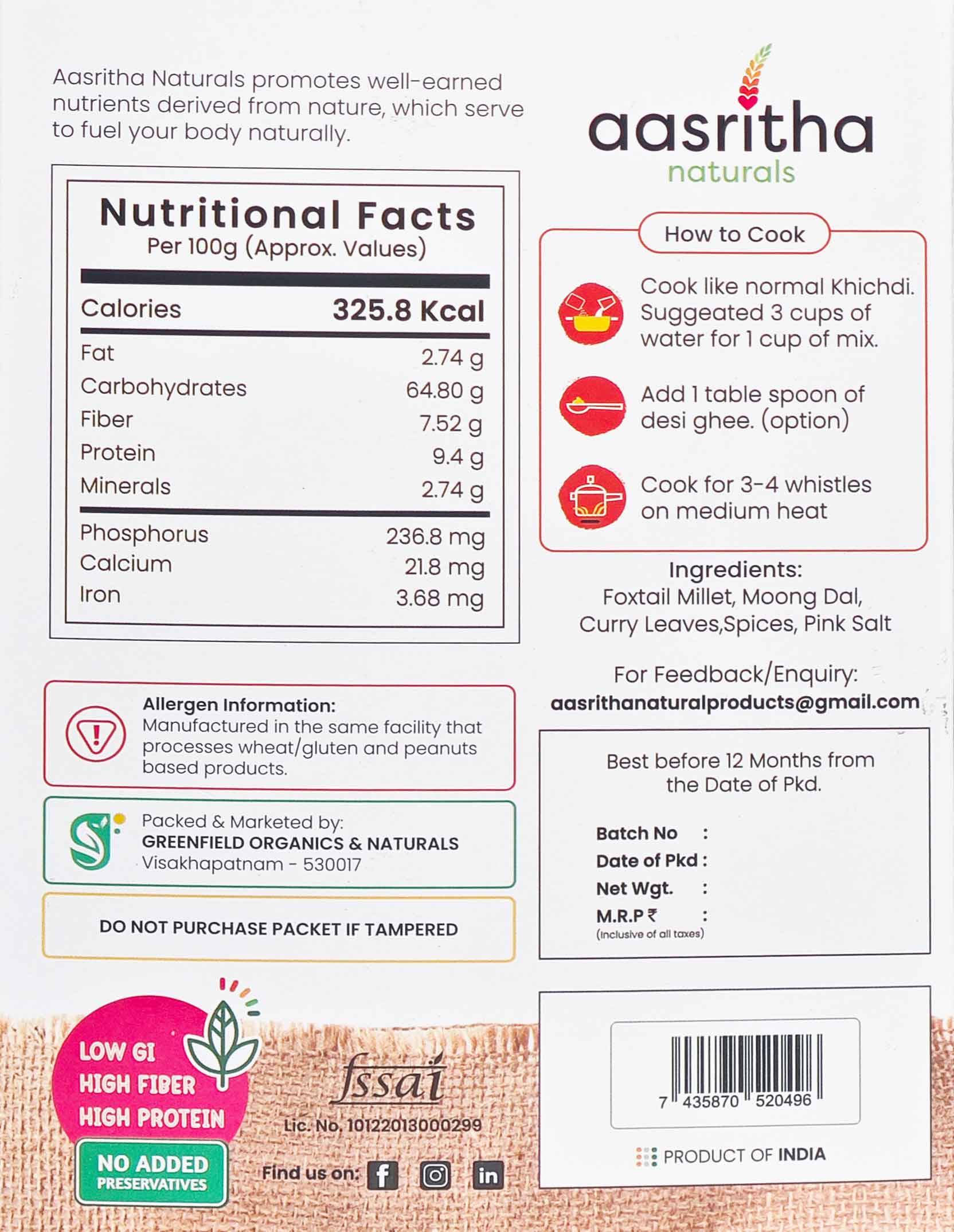 Experience the goodness of tradition and nutrition in every bowl with Multi Millet Khichadi Mix – a wholesome blend of nutrient-rich millets and lentils. Made with a perfect mix of Foxtail, Kodo, Little, Barnyard, and Proso millets, this mix delivers high fiber, protein, and essential minerals for a balanced, hearty meal.